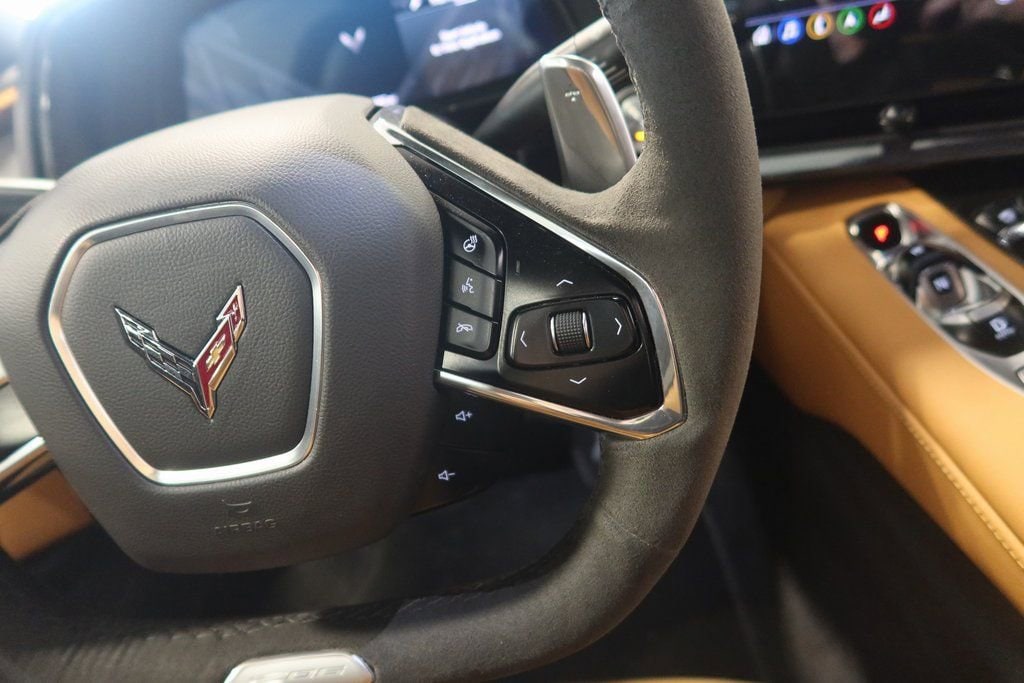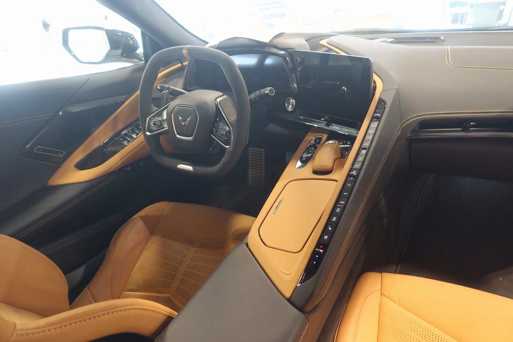 Step inside and you'll be greeted by the Corvette's exquisite Stealth Interior Trim Package, featuring a carbon fiber cluster-surround and console/door switch plates, as well as a sueded microfiber-wrapped steering wheel. The GT2 bucket seats provide exceptional comfort and support, while the Front Lift Adjustable Height with Memory function ensures a seamless entry and exit.
