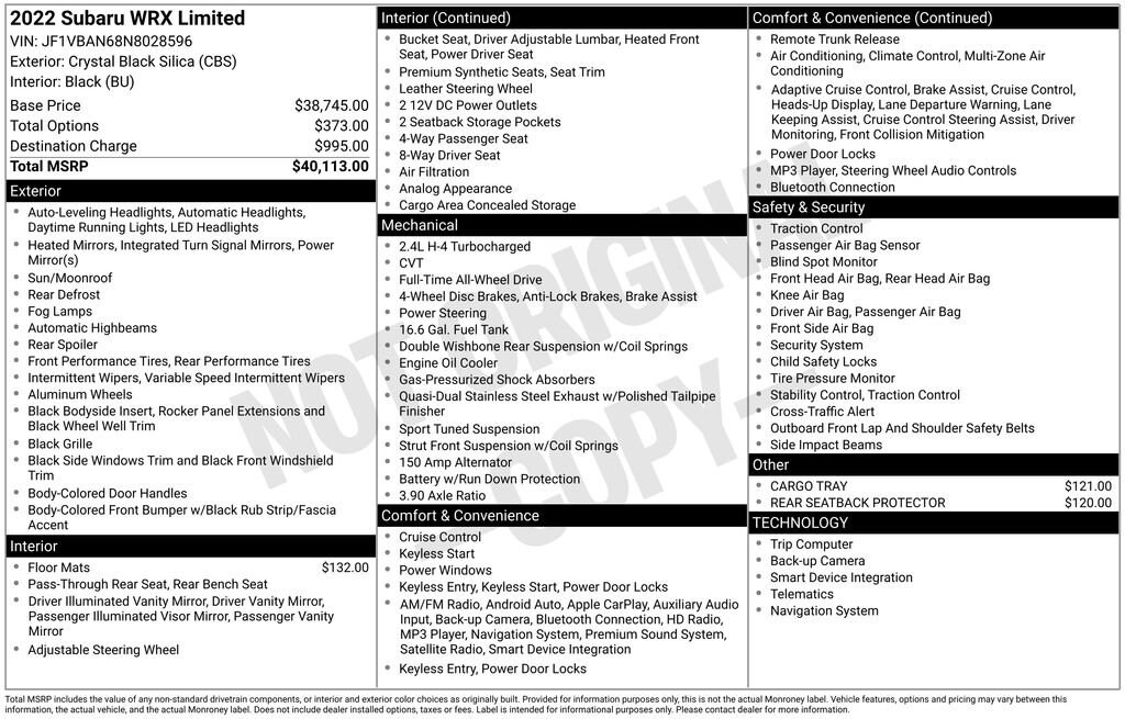 Combining turbocharged performance, all-weather capability, and a wealth of premium features, this 2022 Subaru WRX Limited is the ultimate sports sedan. Experience the thrill of the open road and the peace of mind that comes with Subaru engineering. Visit our showroom today to take this exceptional vehicle for a test drive.